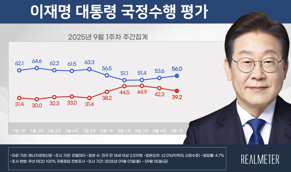 2025년 9월 12일, 여론조사 기관 리얼미터의 주간 집계에 따르면, 이재명 대통령의 국정 지지율이 전주 대비 2.1%p 상승한 56.0%를 기록했다. 이는 취임 초 50% 중반대를 유지했던 지지율이 3주 연속 상승하며 다시금 50%대를 굳건히 한 것으로 분석된다. 정당 지지율에서는 더불어민주당이 44.6%, 국민의힘이 36.2%를 기록하며 여야 간 격차가 8.4%p로 벌어졌다. 이 데이터는 대통령의 국정 운영 방향과 여당의 최근 행보가 국민적 동의를 얻고 있음을 시사한다.